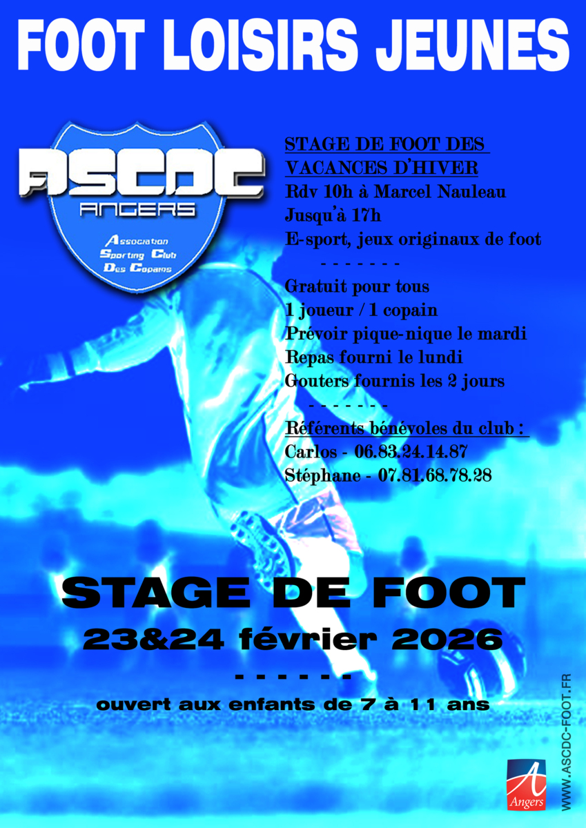 L'ASCDC organise un stage GRATUIT pour les jeunes de 7 à 11 ans le lundi 23 fevrier et le mardi 24 fevrier. Ce stage est ouvert à tous et toutes.